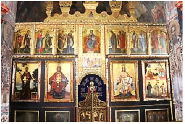Ikonostasi i manastirit të Krušedolit, me në qendër Jezu Krishtin, i rrethuar me ikonat e apostujve dhe të shenjëtorëve të kishës ortodokse, mes tyre ndodhet ikona e Shen Nënë Angjelinës dhe ikona me të katër së bashku, Shen Nënë Angjelina, Shen Stefanit, Shen Johanit dhe Shen Maksimit.
