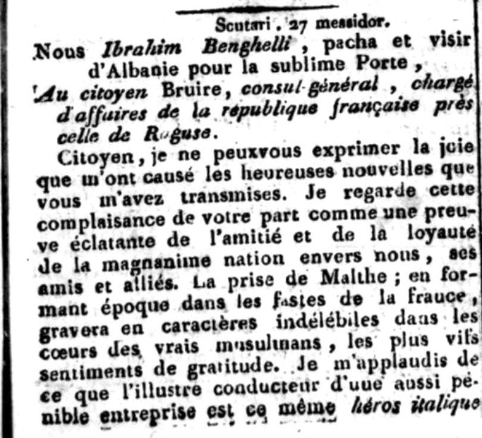 1798- “Gëzohem për arritjet e mikut tim Bonapart…” – Letra e pashait dhe vezirit të Shqipërisë për Portën e Lartë drejtuar konsullit të përgjithshëm të Republikës franceze në Raguzë
