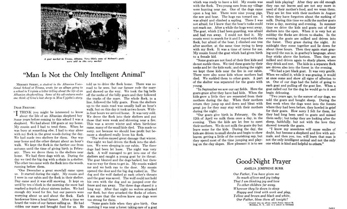 Unë mendoj se mund t’ju interesojë të dini për jetën e një bariu të ri shqiptar. Disa vite para se të vija në këtë shkollë kam qenë bari. Në shtëpinë time kishim rreth 150 dhi. Unë dhe kushëriri im duhej të kujdeseshim për to. Kur ai ishte i zënë me diçka tjetër, më duhej të qëndroja vetëm me tufën time në pyllin e madh gjatë ditës. Kishim ndërtuar dy stane për to. Njëri ishte afër shtëpisë dhe tjetri rreth një orë në këmbë. Kopenë e kemi mbajtur në stanin më të largët nga vjeshta deri në kohën e lindjes në shkurt. Pastaj i çuam në stanin afër shtëpisë. Ne kishim tre qen me vete. Gjatë ditës e lidhnim qenin e madh me zinxhir në stan. Dy të tjerët vinin me tufën në pyll, duke vrapuar përpara tyre.