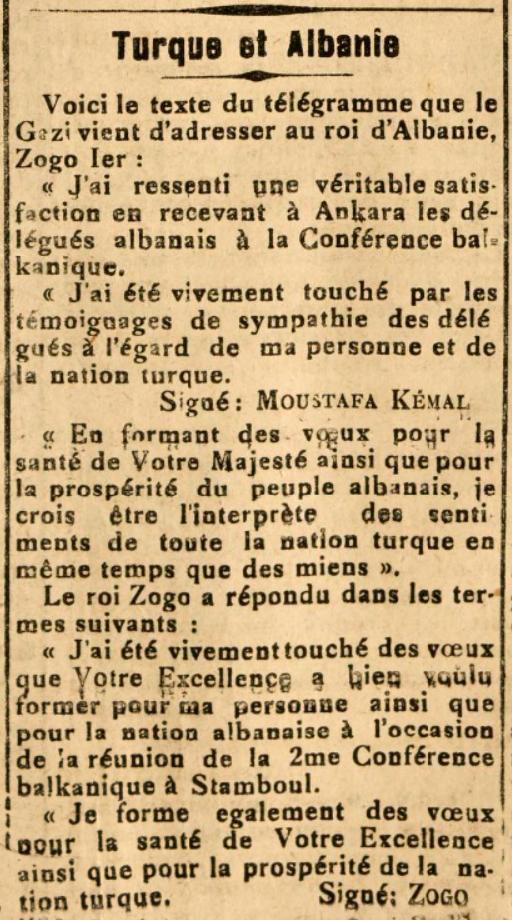 1931- Telegramet e shkëmbyera midis Mustafa Kemal Ataturkut dhe Mbretit Zog me rastin e Konferencës së 2-të Ballkanike në Stamboll
