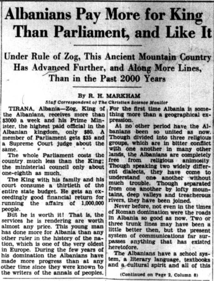 Tiranë, Shqipëri — Zogu, Mbreti i Shqiptarëve, merr më shumë se 3000 dollarë në javë dhe Kryeministri i tij, zyrtari më i paguar në mbretërinë shqiptare, vetëm 80 dollarë. Një anëtar i Parlamentit merr 35 dollarë dhe një gjyqtar i Gjykatës së Lartë po aq.