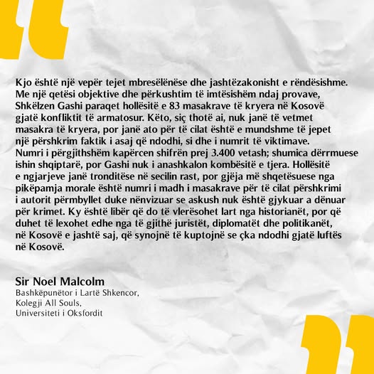 Historiani dhe akademiku i shquar britanik Sir Noel Malcolm, një nga njohës dhe ekspertët më të mirë me famë botërore të historisë së Ballkanit, që njihet gjërësisht për punimet e tij me vlera të pakundërshtueshme shkencore, autor edhe i librave “Kosova: Një Histori e Shkurtër” (1998) dhe “Bosnja: Një Histori e Shkurtër” ka shprehur mendimin e tij shumë vlerësues për botimin e librit “Masakrat 1998-1999” me autor Shkëlzen Gashi që sjell me fakte dëshmitare krimet monstruoze të makinerisë kriminale të Serbisë së kohës së Milosheviçit.