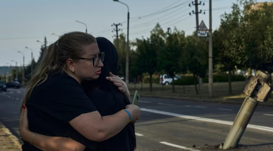 Banorët lokalë duke përqafuar njëri-tjetrin, pas rrëzimit të një rakete ruse në Kramatorsk të Ukrainës.
