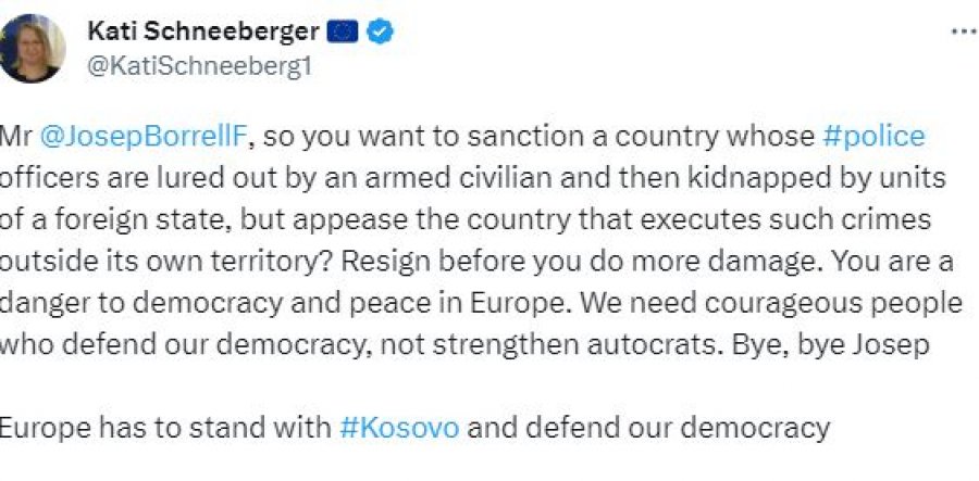 Masat e shpallura ndaj Republikës së Kosovës nuk janë vetëm skandal dhe dëmtojnë besueshmërinë dhe reputacionin e BE-së, por rrezikojnë edhe sigurinë e të gjithëve ne. Ka presion mbi Republikën e Kosovës, e cila po zbaton demokracinë dhe sundimin e ligjit, siç presim nga një vend demokratik që dëshiron të bëhet anëtar i BE-së. Nga ana tjetër po paqtoheni me agresorin dhe autorin e vërtetë i përshkallëzimeve dhe sulmeve brutale ndaj paqeruajtësve të NATO-s. Kjo është përmbysje midis agresorit dhe viktimës. Në këtë mënyrë ne forcojmë autokratët dhe nacionalistët dhe dobësojmë demokracinë dhe shtetin e së drejtës.