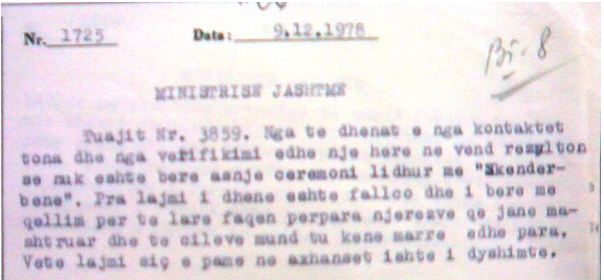 Ndoshta edhe për shkak të Platformës së Sigurimit të Shtetit që e ndalonte një gjë të tillë në mënyrë kategorike, gjë të cilën vetë ministri Kadri Hazbiut, ishte i pari që duhet ta zbatonte. Po kështu, aty jepet dhe një i persona i katërt, Skënder Hoxha, të cilit ndryshe nga tre të tjerët, që kanë marrë rroga dhe shpërblime, ai ka marrë vetëm fletë nderi dhe një shpërblim për 15.000 lekësh