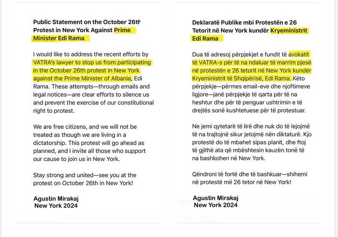 Dua të adresoj perpjekjet e fundit te avokatit te VATRA-s per te na ndaluar te marrim pjese në protestën e 26 tetorit ne New York kundër Kryeministrit te Shqiperise, Edi Rama.