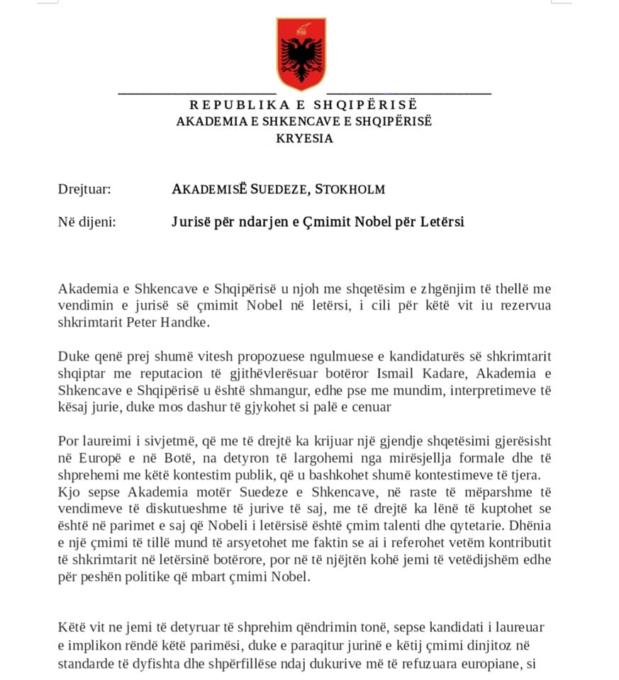Akademia e Shkencave e Shqipërisë letër për Nobelin në Letërsi: Fituesi i papranueshëm, akt i rëndë i dhunimit të vlerave njerëzore