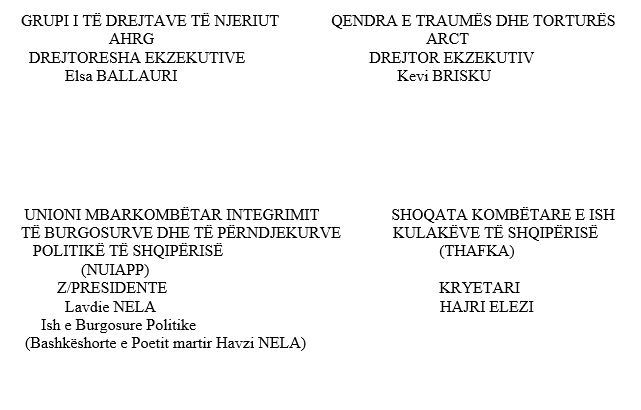 Grupi i të Drejtave dhe Lirive të Njeriut, Qendra e Traumës dhe Torturës, Unioni Mbarkombëtar Integrimit të Burgosurve dhe të Përndjekurve Politikë të Shqipërisë, Shoqata Kombëtare e ish Kulakëve të Shqipërisë që në vitin 2022 i kan paraqitur Kuvendit të Shqipërisë për të drejtuar Avokatin e Popullit, që në fokus ka “Të Drejtat dhe Liritë e Njeriut” një Personalitet antikomuniste, Misionar i Dokumentimit dhe dënimit të krimeve të komunizmit, Përçues i paqes dhe jo urretjes, Zë i pa ndalur në mbrotje të drejtave dhe lirive të Njeriut për shtresën antikomuniste që përfaqëson 40% të popullit shqiptar, Zotin Besim NDREGJONI! Ne si Shoqëri Civile, Kulakët, të Burgosurit dhe të Përndjekurit Politik jemi tepër të shqetësuar që mbas tre dekadash akoma hezitohet nga politika për promovimin e kanditaturve antikomuniste që i demokratizojnë institucjonet dhe nuk i politizojnë ato!