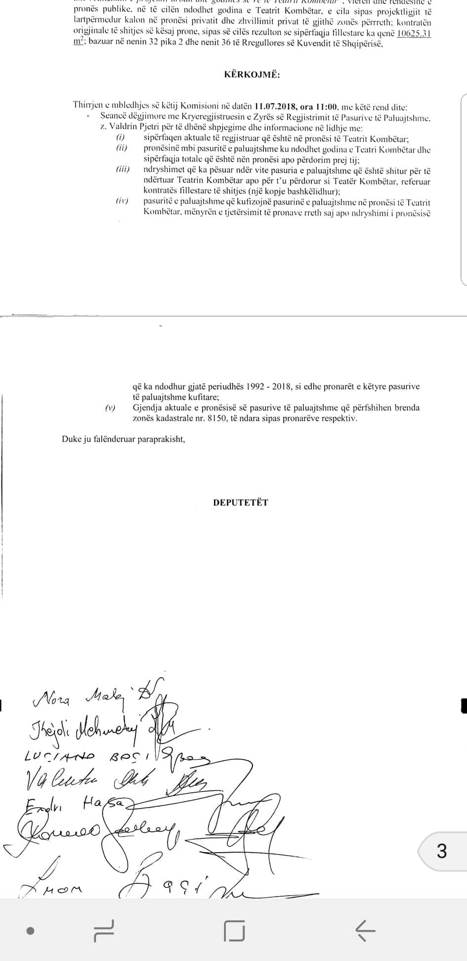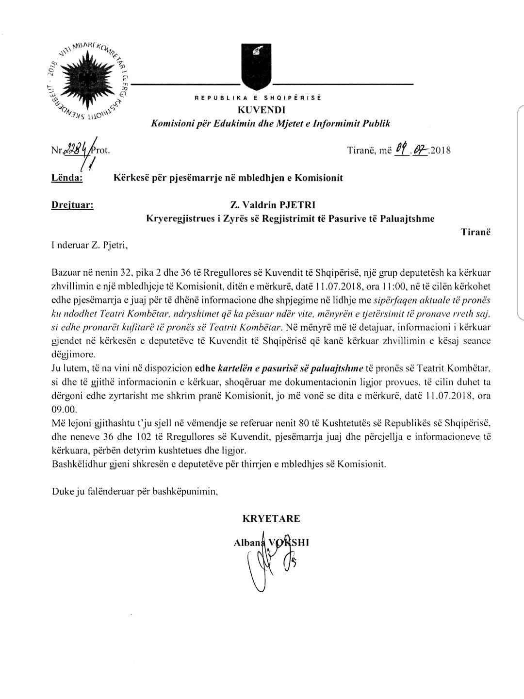 Albana Vokshi kërkon paraqitjen në Komisionin Parlamentar të Valdrin Pjetrit, Kryeregjistrues i ZRPP bashkë me dokumentacionin që lidhet me Teatrin Kombëtar