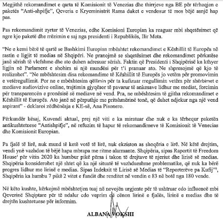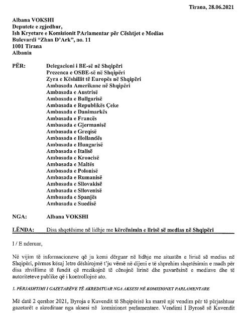 Albana Vokshi letër zyrtare trupit diplomatik në Shqipëri: Ja problematikat që po rrezikojnë seriozisht lirinë e medias