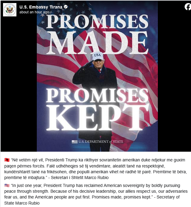 “Aleatët na respektojnë, kundërshtarët na frikësohen”- Ambasada e SHBA shpërndan deklaratën e Rubios: Trumpi riktheu sovranitetin amerikan
