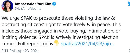 Ambasadorja Kim thirrje SPAK: Ndiqni penalisht të gjithë ata që shkelin ligjin dhe pengojnë qytetarët të votojnë lirisht!
