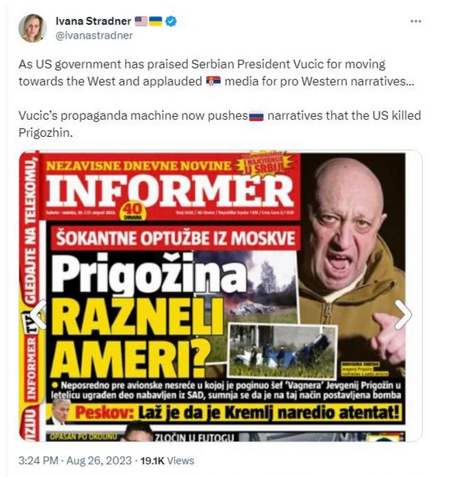 “Makina propagandistike e Vuçiqit tani po shtynë narrativat ruse se SHBA-ja e ka vrarë Prigozhin”, shkruan Stradner në rrjetin social X.