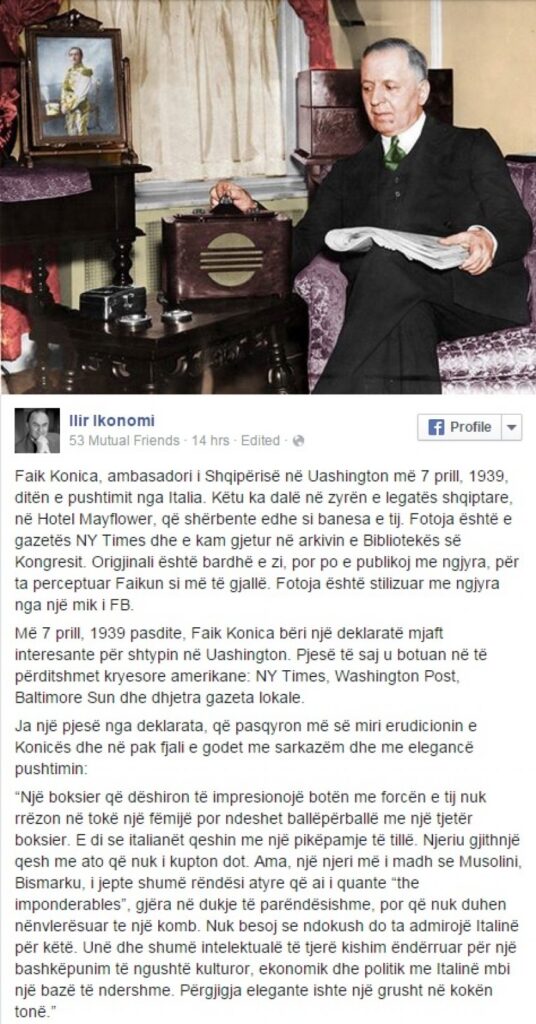 “Më 7 prill, 1939 pasdite, Faik Konica bëri një deklaratë mjaft interesante për shtypin në Washington. Pjesë të saj u botuan në të përditshmet kryesore amerikane: NY Times, Washington Post, Baltimore Sun dhe dhjetra gazeta lokale.