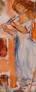 Sa fantazi ka ky kompozim, natyrshmëri dhe lirizëm, mendim, skena, përveç protagonistit ëndërrimtar me fletë ndër duar, që i studion, pra piktorit brenda në pikturë, ka dhe personazhe të tjerë, brenda tablosë një tjetër tablo, dy portrete, klasikët baba e mama, t’i ribësh në telajon mbi kambecët nëpër lulet poshtë këmbëve, që rriten në shpirt, një copëz toke me sigurinë e lumturisë dhe ja, një vajzë shtat-hedhur si prej shiu, dashuria me flaut, piktura ka dhe muzikë të heshtur, një kolorit të lehtë parajsor, që i ngjan fundit të një ëndrre në prag të një zgjimi…
