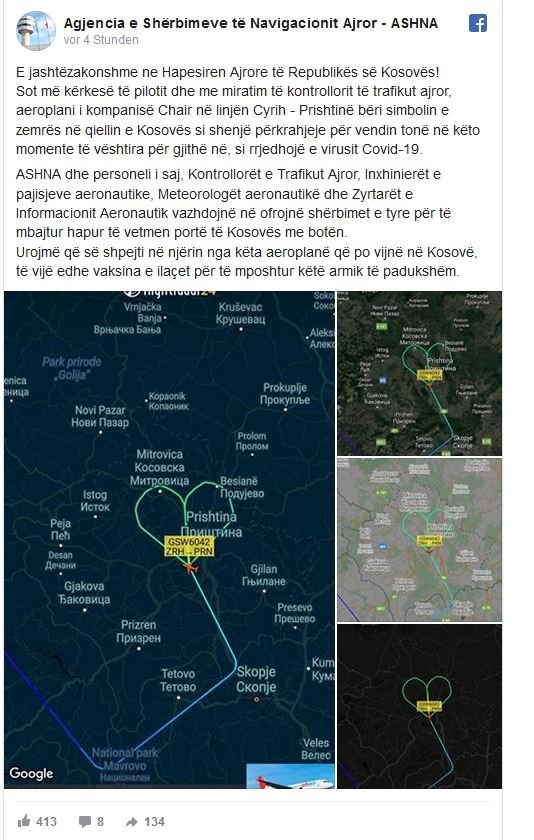 ASHNA: Aeroplani i linjës Zyrih-Prishtinë bëri simbolin e zemrës në qiellin e Kosovës