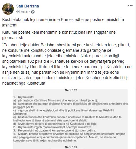 Berisha: “Edi Rama nuk mund të jetë Ministër i Jashtëm, ia ndalon Kushtetuta”