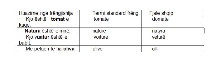 Sa i përket gjuhës së folur huazimet leksikore janë dukuri e rregullt, shqipja ndikohet dukshëm nga frëngjishtja, në fakt shqipja funksionon duke u ndihmuar nga frëngjishtja. Nevoja e komunikimit, domosdoshmëria e pasjes së fjalëve të reja që i mungojnë në shqip i shtyn ata të përdorin fjalë nga frëngjishtja. Ja disa shembuj fjalish ku kanë depërtuar huazime nga frëngjishtja dhe duket një përzierje e theksuar. Fjalët e reja nga frëngjishtja që përdoren në shqip pësojnë ndryshime fonetike të shqipes, përshtaten në gjini dhe trajtë. Ndonjë herë përdoren edhe fjalë nga frëngjishtja të pa ndryshuara.