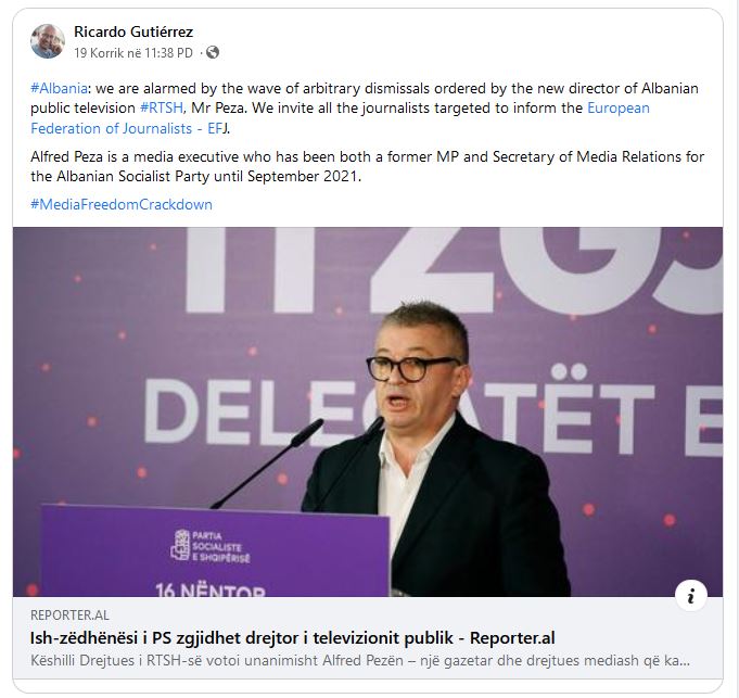 Pas lajmit se ish-zëdhënësi dhe deputeti i PS Alfred Peza zgjidhet drejtor i RTSH-së në shkelje të hapur të ligjit ka reaguar Ricardo GutiérrezSekretari i Përgjithshëm i EFJ (Secrétaire Général në European Federation of Journalists – EFJ) – si më poshtë: