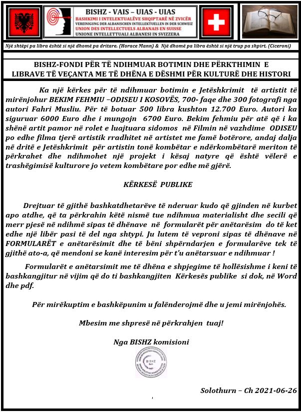 Ka një kërkes për të ndihmuar botimin e Jetëshkrimit të artistit të mirënjohur BEKIM FEHMIU –ODISEU I KOSOVËS, 700- faqe dhe 300 fotografi nga autori Fahri Musliu. Për të botuar 500 libra kushton 12.700 Euro. Autori ka siguruar 6000 Euro dhe i mungojn 6700 Euro. Bekim fehmiu për atë që i ka shënë artit pamor në rolet e luajtuara sidomos në Filmin në vazhdime ODISEU po edhe filma tjerë artistik rradhitet në artistet me famë botërore, andaj dalja në dritë e Jetëshkrimit për artistin tonë kombëtar e ndërkombëtarë meriton të përkrahet dhe ndihmohet një projekt i kësaj natyre që është vëlerë e trashëgimisë kulturore jo vetem kombëtare por edhe më gjërë.