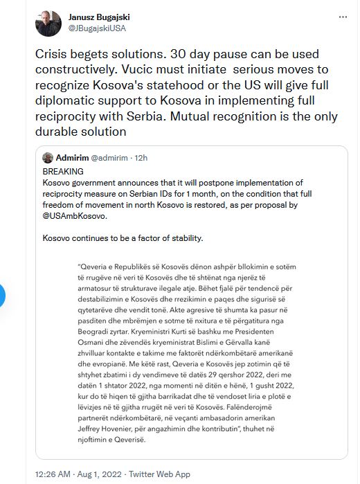 SHBA mund të ndërpresë marrëdhëniet destruktive të Serbisë me Rusinë dhe Kinën duke zgjidhur ngërçin me Kosovën, dhe sipas tij, “përgjigjja përfundimtare nuk është dialogu i udhëhequr nga BE, por rruga drejt anëtarësimit në NATO si për Prishtinën, ashtu edhe për Beogradin”.