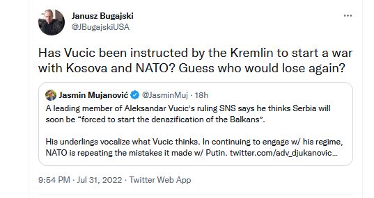Bugajski: A është udhëzuar Vuçiq nga Kremlini të nisë luftë ndaj Kosovës dhe NATO-s? A e merrni me mend se kush do të humbiste përsëri!