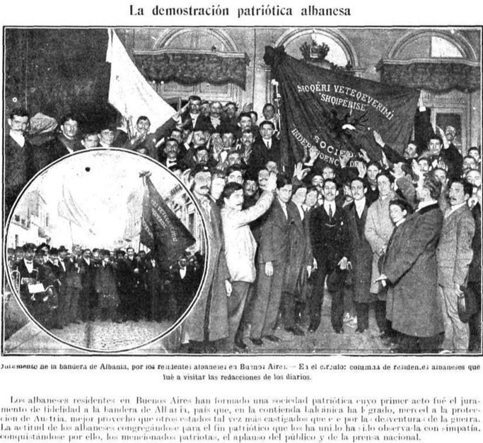 Shqiptarët me banim në Buenos Aires kanë formuar një shoqëri patriotike “Shoqëri Veteqeverimi – Shqipërise”, akti i parë i së cilës ishte betimi për besnikëri ndaj flamurit të Shqipërisë, një vend që, në konfliktin ballkanik, ka arritur, falë mbrojtjes së Austrisë, avantazh më të mirë se shtetet e tjera, ndoshta më të dënuara se ai nga fatkeqësitë e luftës. Qëndrimi i shqiptarëve të mbledhur për qëllimin atdhetar, u vëzhgua me simpati, gjë që u dha këtyre patriotëve duartrokitjet e publikut dhe të shtypit kombëtar.