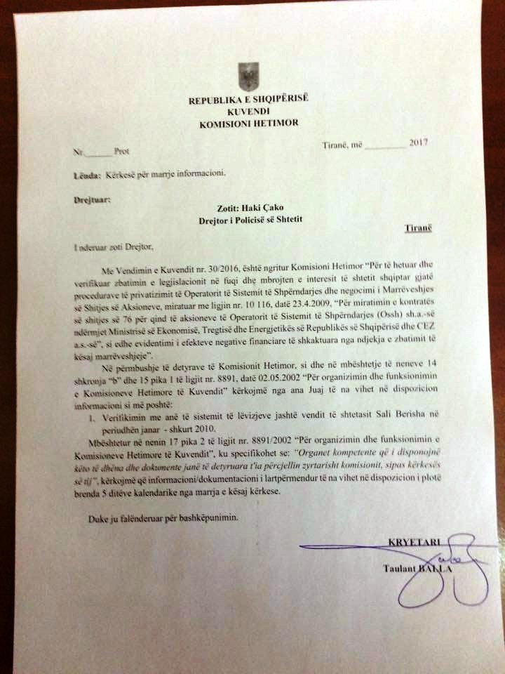 Vetë letra e dërguar paraqet problematikën se si është vepruar në shkelje të mundshme të ligjit me investimet te Operatori i Sistemit të Transmetimit nga qeveria shqiptare dhe zv.kryeministrja, njëkohësisht ministrja e Infrastrukturës dhe Energjisë Belinda Balluku. Kjo e fundit është pezulluar nga detyra prej Gjykatës së Posaçme Kundra Krimit dhe Korrupsionit të Organizuar për akuzat nga SPAK për shpërdorim detyre dhe paracaktim tenderash në grup.
