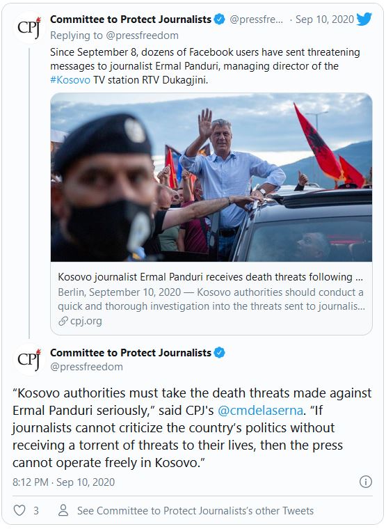 Komiteti për Mbrojtjen e Gazetarëve, me seli në Shtetet e Bashkuara, tha të enjten se autoritetet në Kosovë duhet të kryejnë hetime të shpejta dhe të plota rreth kërcënimeve drejtuar gazetarit Ermal Panduri, dhe të kujdesen për sigurinë e tij.