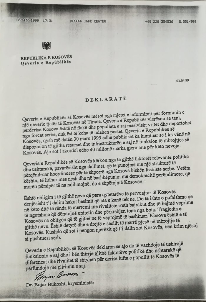 Deklarata e ish kryeministrit Bukoshi e datës 3 prill 1999 (dokument) – Nga XHAFER LECI