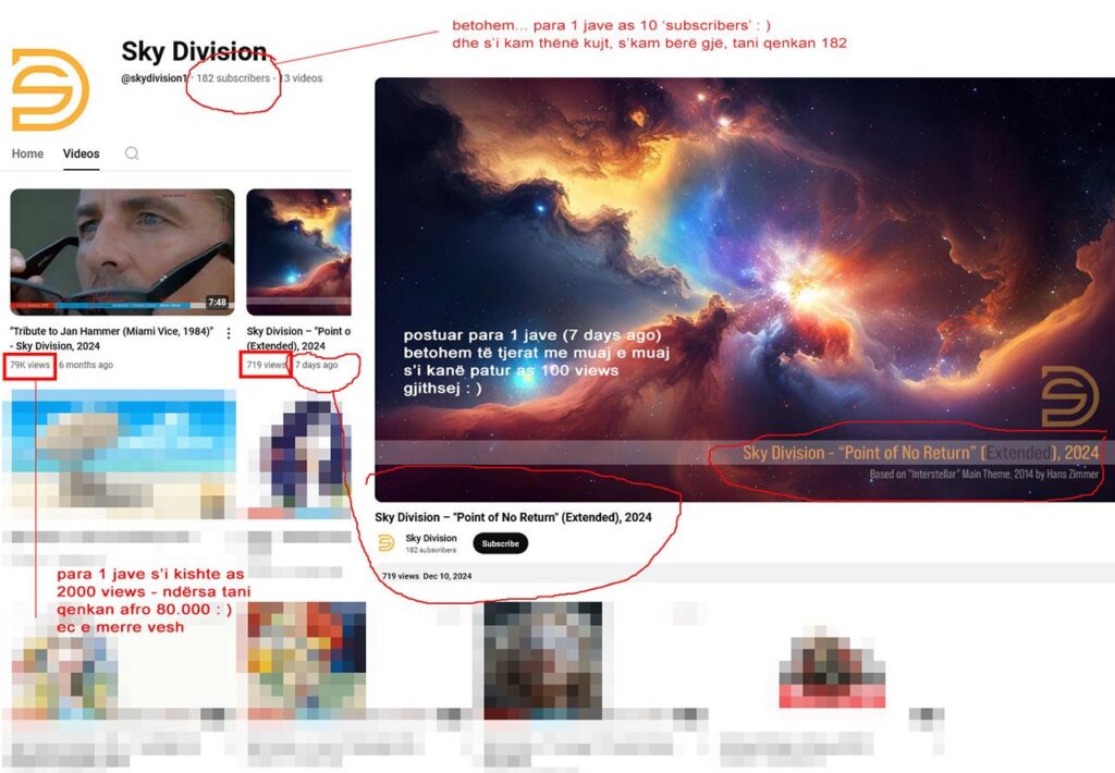 [ ngjitur dhe çudia 1-javore me Youtube, le t’jetë si plotësim 100% i çudisë – meqë para 1 jave ju pata informuar rreth suksesit (nisur si screenshot, pata bërë shaka me video-kanalin e Youtube), betohem që para 1 jave Sky Division s’i kishte as 10 “subscribers” (anise hapur pothuaj para 2 vitesh) tani i paska mbi 180 ndjekës, ku është 10 e ku 180 – betohem se para 1 jave njëra nga videot s’i kishte as 2000 views… tani afro 80. 000, ku është 2000 e ku 80. 000, betohem që s’kam bërë gjë… përveç se ju pata informuar me grafikat qesharake : )