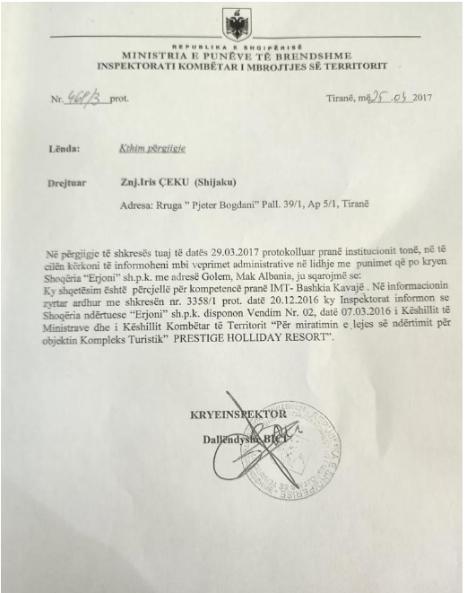 Letra për digën e Xhafzotaj lidhet me vendimin nr. 17, datë 17.03.2021 të Agjencisë së Zhvillimit të Territorit, por paraqet problematikë të ngjashme ashtu si vendimi nr. 16, datë 17.03.2021 i AZHT-së pasi ky i fundit është kallëzuar në Prokurorinë e Tiranës.