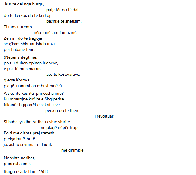 U trondita dhe u preka dhe shkruajta një poezi fshehurazi, është në fletoret e mia të burgut… dhe do të botohej më pas në librat e mi “Si shkohet në Kosovë”/ “Si është Kosova” si dhe në botimin anastatik “Dorëshkrimet e fshehta të burgut”, edhe është përkthyer dhe në gjuhë të tjera…