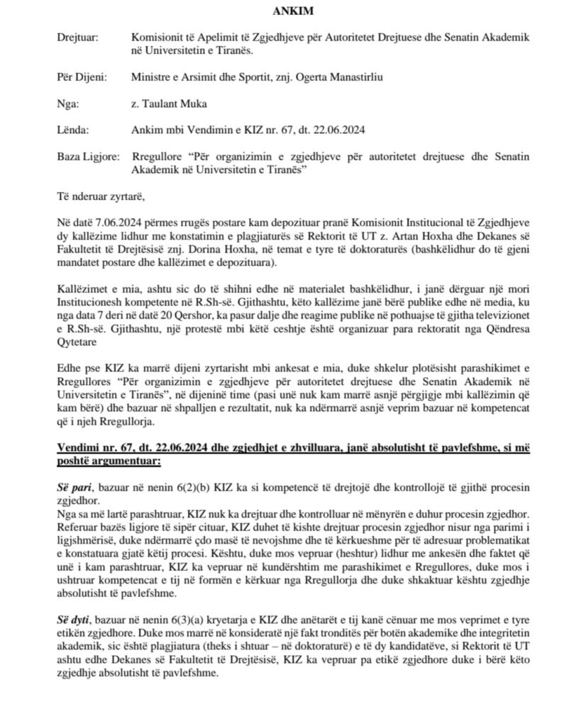 Kërkesa për Anulimin e Vendimit të Komisionit Zgjedhor të Universitetit të Tiranës për Zgjedhjen e Rektorit, Kërkesë që i Kam Dërguar Komisionit të Apelimit të UT!