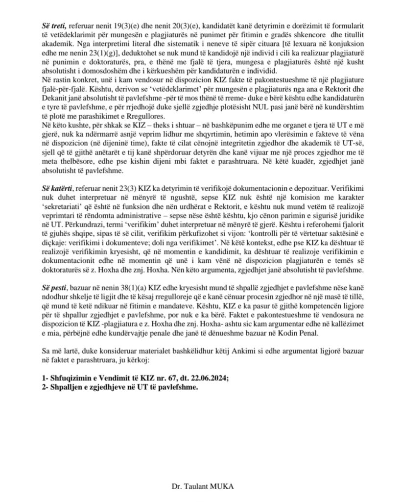 Komisioni Zgjedhor (KIZ) ka vepruar në kundërshtim me ligjin duke lejuar kandidaturat e rektorit z. Artan Hoxha dhe Dekanes znj. Dorina Hoxha, të cilat përmbajnë plagjiaturë në punimet doktorale.