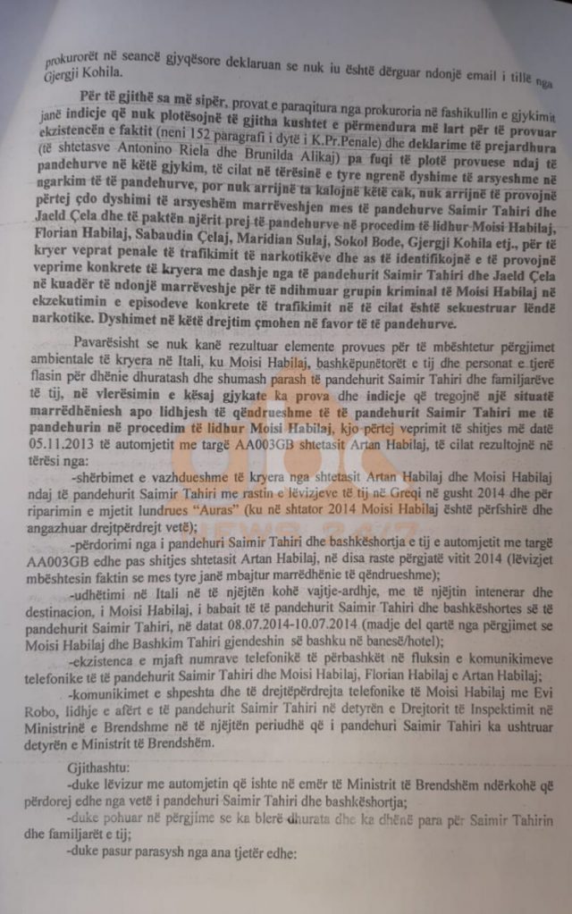 Nga verifikimet e kryera nga Prokuroria per Krime te Renda, per levizje te mundshme te perbashketa mes të pandehurit Saimir Tahiri apo familjareve te tij me te pandehurit ne procedim te lidhur Moisi Habilaj, Florian Habilaj etj., ka rezultuar lëvizja njejten dite, ne vajtje dhe kthim, me te njejtën linjë avioni dhe të njëjtin destinacion, të bashkeshortes dhe babait te te pandehurit Saimir Tahiri dhe e të pandehurit ne procedim te lidhur Moisi Habilaj.