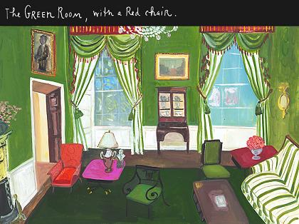 Dhoma e Gjelbër, me një kolltuk të kuq.