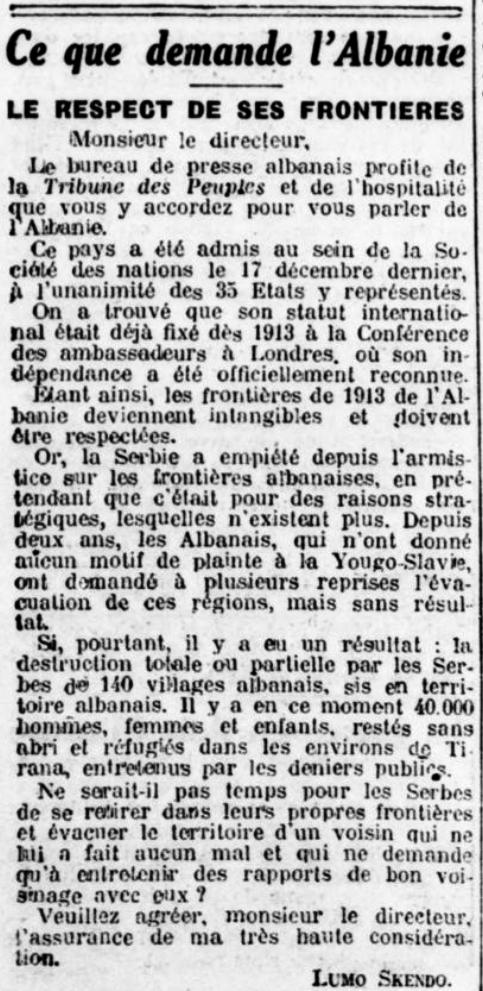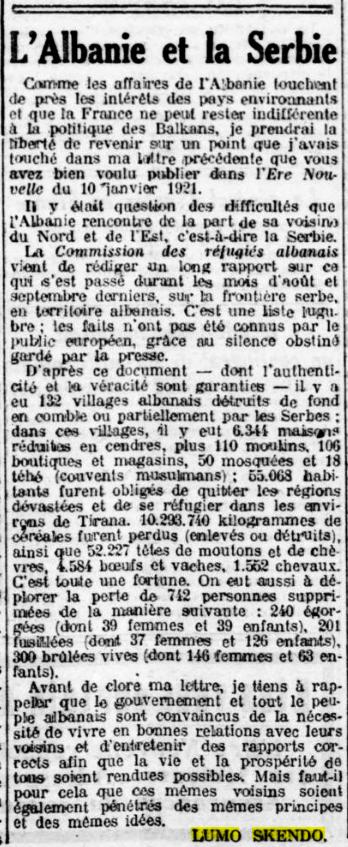 Dy letra ekskluzive të Mit’hat Frashërit (Lumo Skëndos) mbi krimet serbe në Shqipëri të botuara në gazetën franceze në janar dhe shkurt të 1921
