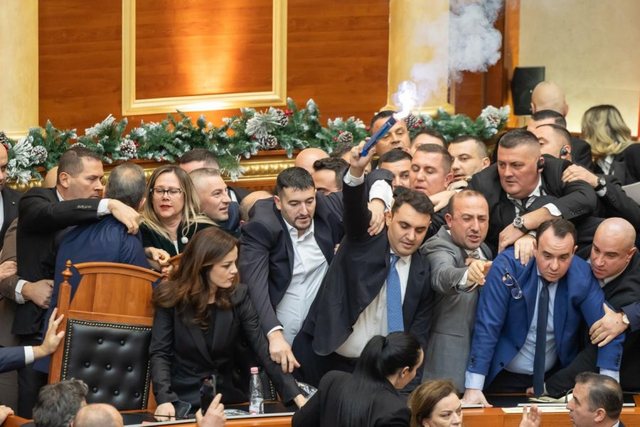Deputetët ndezën flakadanë, hodhën ujë drejt kryetarit të Kuvendit dhe i zunë vendet e ministrave të Qeverisë, në një përpjekje për të ndërprerë seancën, përpara se të ndërhynte policia.