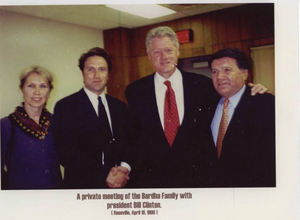 Takim privat me Presidentin Bill Clinton, 16 prill 1998, një vit para ndërhyrjes së NATO-s në Kosovë. Ekrem dhe Lumtëri Bardha. Pranë presidentit një nga djemtë, Ilir Bardha
