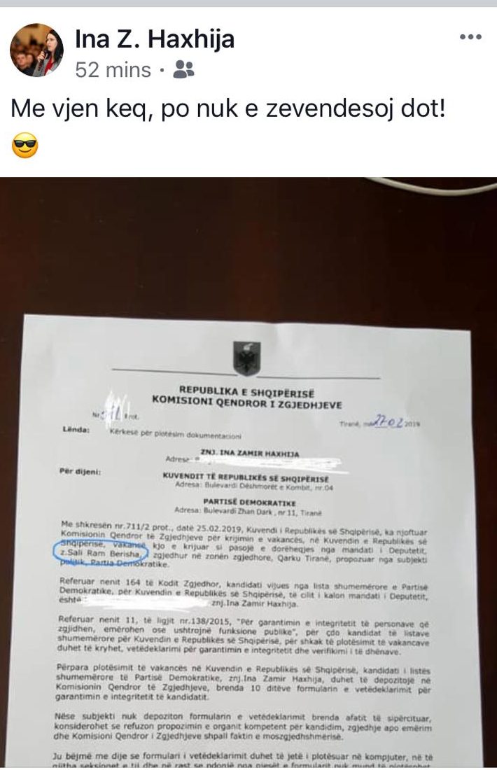 “Ja konkretisht nga tryeza ime e punës sot, shembujt konkretë, krejt aktualë, pse unë i kam kërkuar Gjykatës Kushtetuese heqjen e pezullimit absurd të një anëtari të qeverisë dhe  pse të pezullosh një ministër (për herë të parë në botë) sjell pasoja që cënojnë konkretisht funksionimin e qeverisë dhe interesin publik”