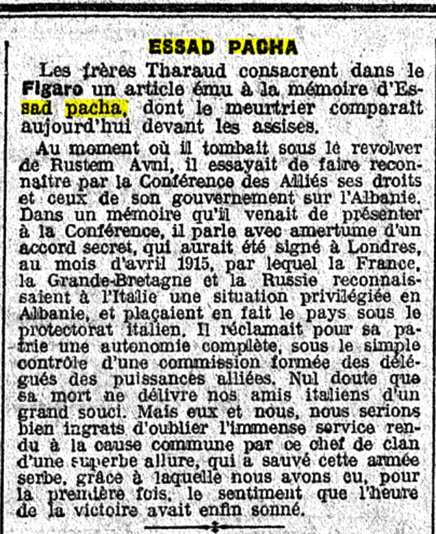 Esat Pasha, pak kohë para se të vritej nga Avni Rustemi, kishte zbuluar një marrëveshje të fshehtë ku Shqipëria do të vendosej nën protektoratin italian