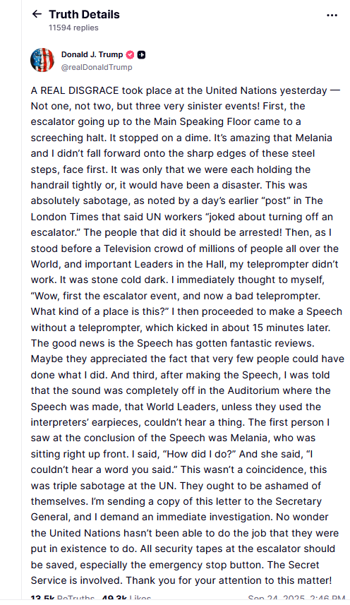 Personi i parë që pashë në përfundim të fjalimit ishte Melania, e cila ishte ulur pikërisht përpara. Unë thashë: “Si ia dola?” Dhe ajo tha: “Nuk munda të dëgjoja asnjë fjalë nga ato që the.” Kjo nuk ishte rastësi, ky ishte sabotim i trefishtë në OKB. Ata duhet të turpërohen nga vetja. Po i dërgoj një kopje të kësaj letre Sekretarit të Përgjithshëm dhe kërkoj një hetim të menjëhershëm. Nuk është çudi që Kombet e Bashkuara nuk kanë qenë në gjendje të bëjnë punën për të cilën u krijuan. Të gjitha kasetat e sigurisë në shkallët lëvizëse duhet të ruhen, veçanërisht butoni i ndalimit emergjent. Shërbimi Sekret është i përfshirë. Faleminderit për vëmendjen tuaj ndaj kësaj çështjeje!”