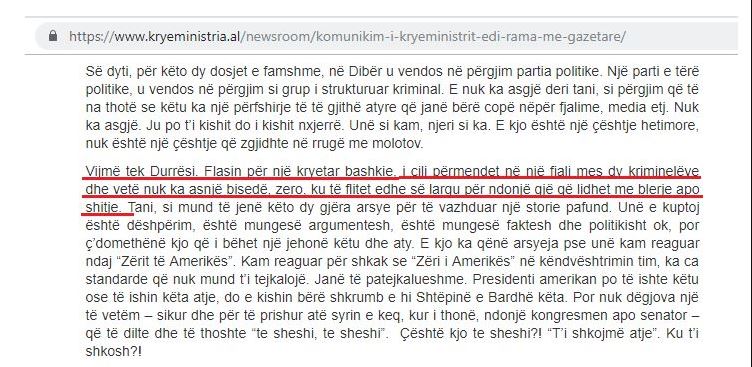 “Ja konkretisht nga tryeza ime e punës sot, shembujt konkretë, krejt aktualë, pse unë i kam kërkuar Gjykatës Kushtetuese heqjen e pezullimit absurd të një anëtari të qeverisë dhe  pse të pezullosh një ministër (për herë të parë në botë) sjell pasoja që cënojnë konkretisht funksionimin e qeverisë dhe interesin publik”