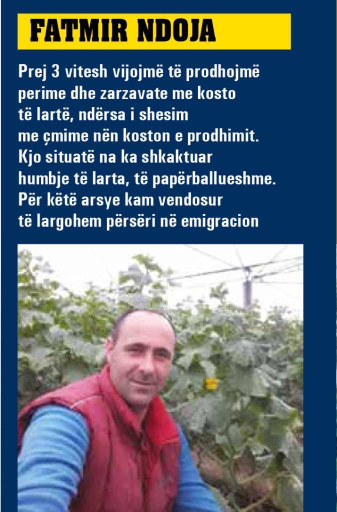 Tashmë prej 3 vitesh vijojmë të prodhojmë perime dhe zarzavate me kosto të lartë, ndërsa i shesim me çmime nën koston e prodhimit. Kjo situatë na ka shkaktuar humbje të larta, të papërballueshme. Për këtë arsye kam vendosur të largohem përsëri në emigracion”, tregon fermeri nga fshati Lunas i Lushnjës, në bisedën e zhvilluar me revistën “Monitor”.