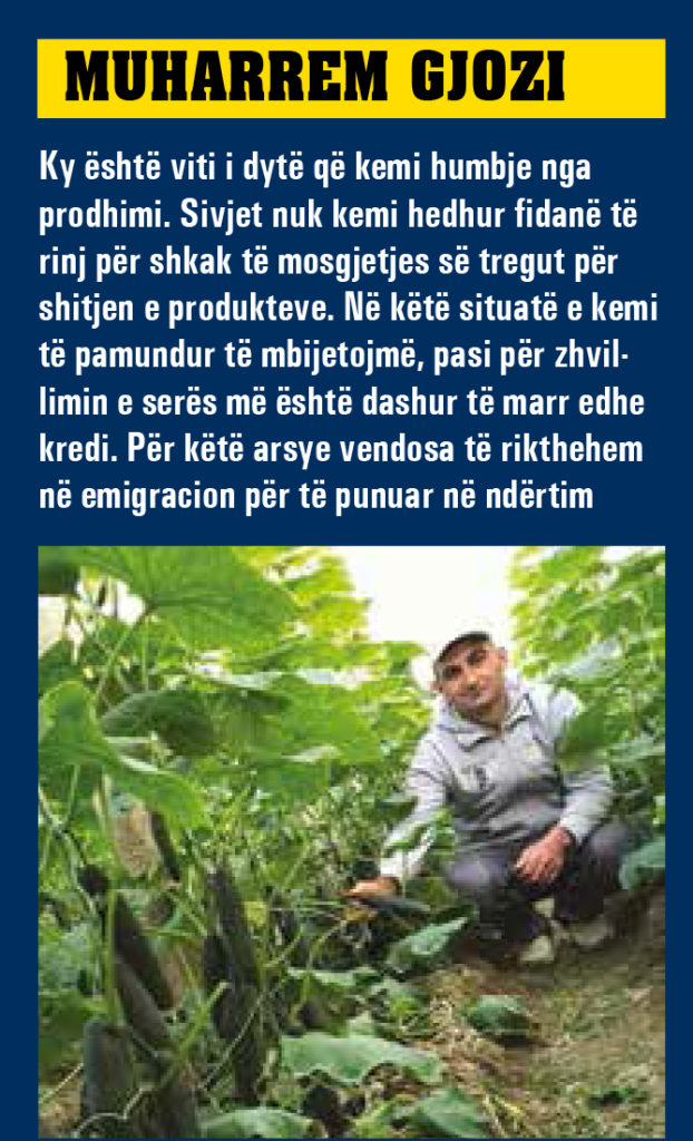 I tillë është rasti i Muharrem Gjozit, 40-vjeçari nga fshati Guriçan. Këtë vit nuk e ka mbjellë serrën me sipërfaqe 3.5 dynymë, që ngriti para 6 vitesh me paratë e fituara nga puna në Greqi, pasi humbjet janë 67% e shpenzimeve për mbjelljen sezonale të një kulture.