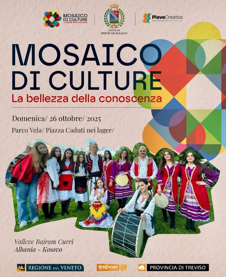 Në pasditën e së dieles së 26 tetorit 2025, në Pieve Di Soligo (TV-Itali) u mbajt Edicioni i Parë i festivalit kulturor “Mosaico Di Culture” (Mozaiku i Kulturave), nën moton “Bellezza Della Conoscenza” (Bukuria e Njohjes). Sikurse ngjyrat e vjeshtës ishin mbledhur mërgimtarët nga mëse 20 vende të botës. Secili nacionalitet e kishte një bukuri të veçantë të veshjeve tradicionale, të valleve, kulturës, traditës dhe historisë, ku të gjitha së bashku e përbënin mozaikun e diversitetit kulturor. Bashkëjetesa dhe diversiteti kulturor janë vlera të një bote të re që po e ndërtojmë.
