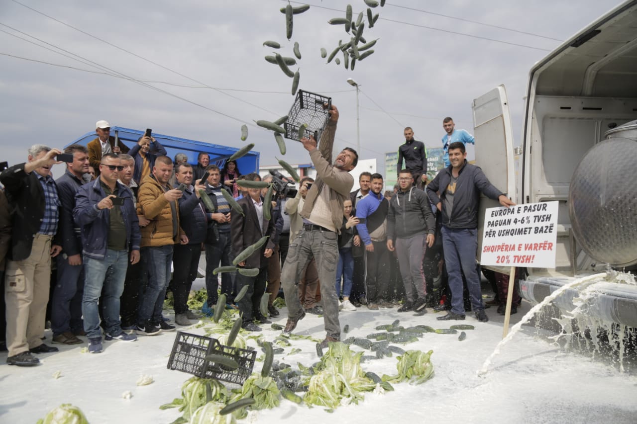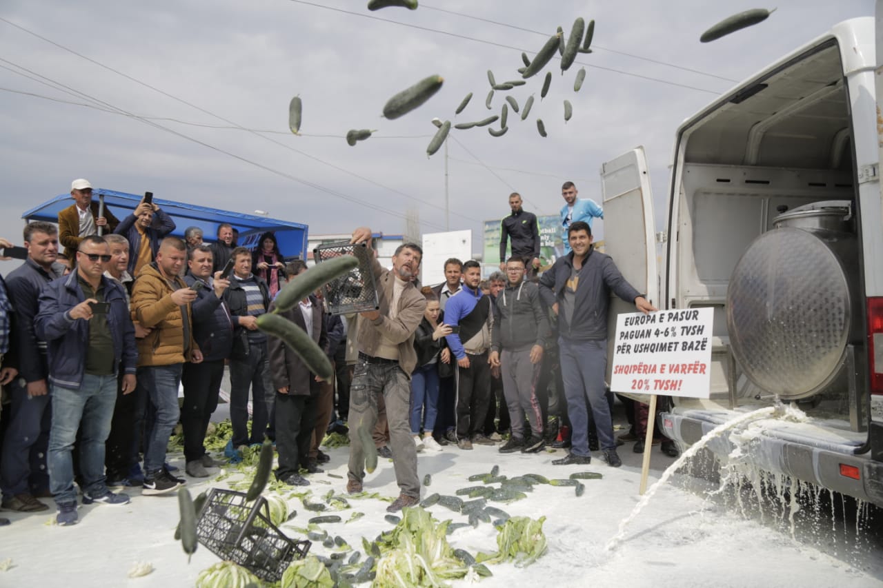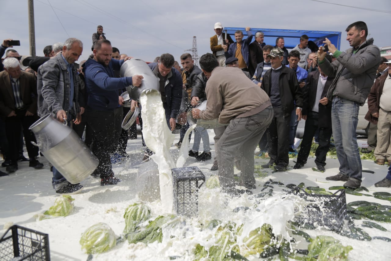 FOTOT – Fermerët në protestë, derdhin bidonat me qumësht e hedhin kastravecët në rrugë