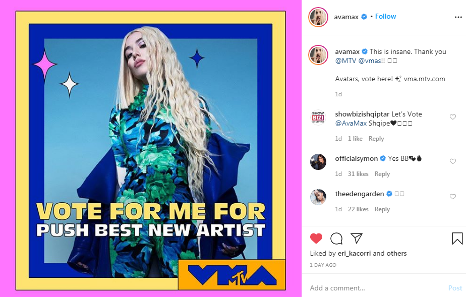 Ava është nominuar në “MTV Music Awards” , në kategorinë Push Best Neëw Artist, “Artisti depërtues i vitit”. “Kjo është çmenduri. Faleminderit MTV”, – shkruan ajo teksa jep lajmin e nominimit.