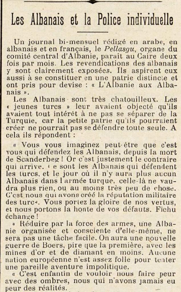 Një gazetë dyjavore e botuar në arabisht, shqip dhe frëngjisht, Pellasgu, organ i komitetit qendror të Shqipërisë, del në Kajro dy herë në muaj. Kërkesat e shqiptarëve janë të parashtruara qartë në të. Ata aspirojnë të formojnë një atdhe më vete dhe kanë marrë si moto : “Shqipëria për shqiptarët”.